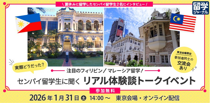 株式会社留学ジャーナル(所在地:東京都新宿区、代表:横山健一)は、留学に関するトークイベント「注目のフィリピン・マレーシア留学!センパイ留学生に聞くリアル体験談」を2026年1月31日(土)に東京留学ジャーナルカウンセリングセンターで開催します。オンライン参加も可能です。参加は無料、事前予約制。