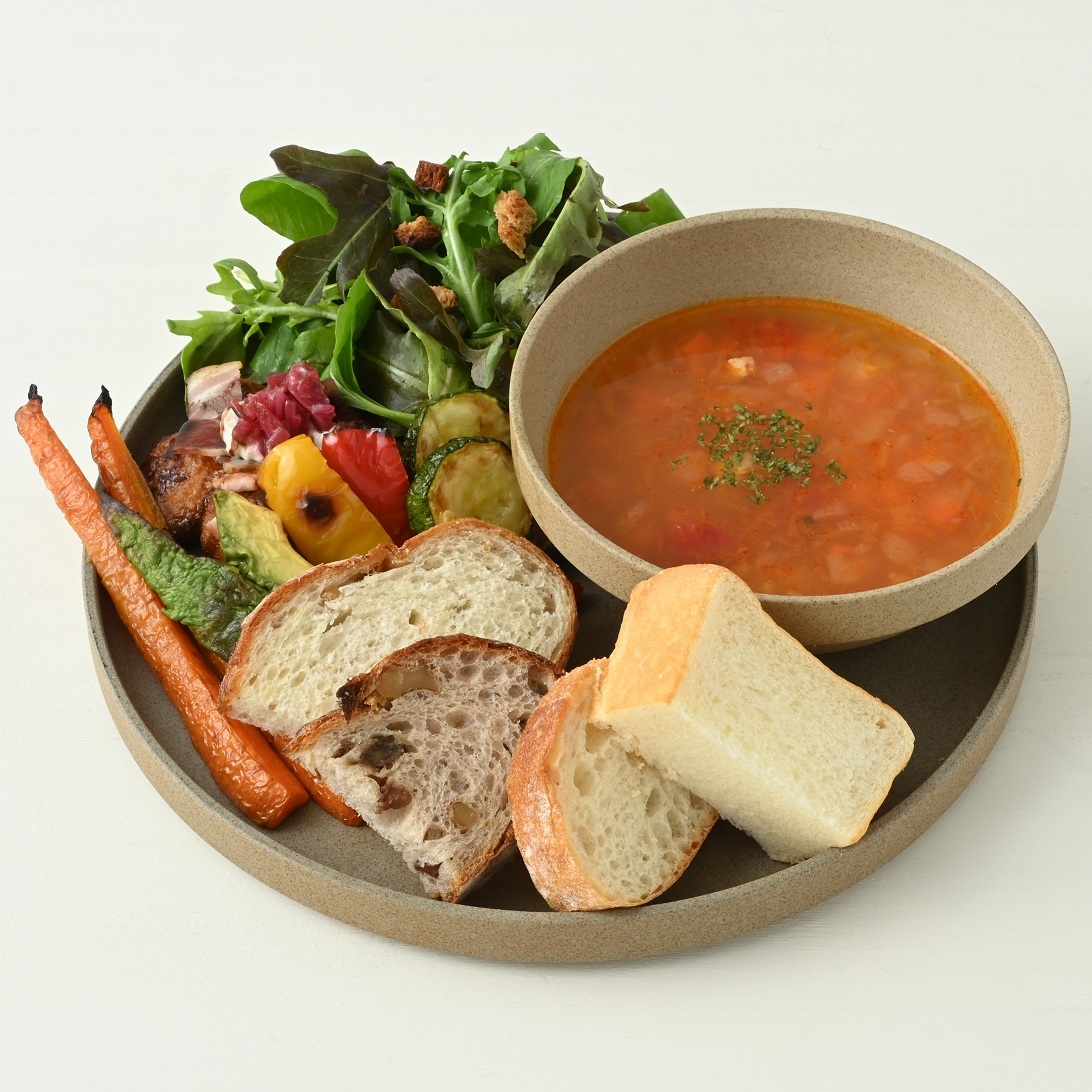 たっぷりのミネストローネスープに4種類のブレッドを盛り合わせたランチプレート。リーフサラダ、ポテトフライ、5種類のグリル野菜を付け合わせに穀物やレーズンなど、様々な味のブレッドが楽しめるプレートです。