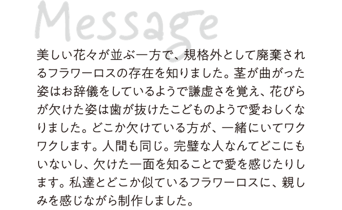 市場出荷規格に満たないとして廃棄される花は生産本数の15%〜30%存在すると言われています。出荷本数から推計するとその年間総廃棄本数は9.25億にも登ります(20%で試算)。わずかに茎に傷がある、茎が真っ直ぐでない、花びらの形が完璧でない等の理由で規格外とされてしまう花たち。ご来場の皆様にお配りすることで、その個性的な姿の魅力を知っていただければ幸いです。