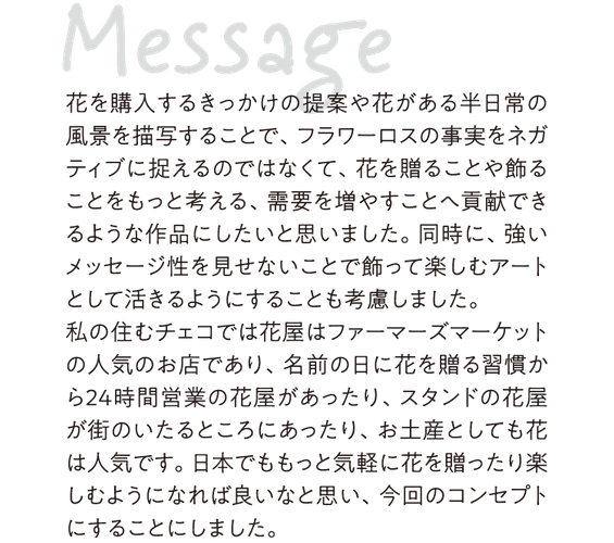 昨年4月緊急事態宣言を受け行き場を失ってしまったために突如大量に発生したフラワーロスの現実を解決するため立ち上げた生家のオンラインD2C販売「スマイルフラワープロジェクト」https://jfc.thebase.in を始めとして、フラワーライフ振興協議会の立ち上げ、フラワーロスの社会課題の解決に向け、持続可能な生産と流通改革、農家支援のための取り組みを行なっている。