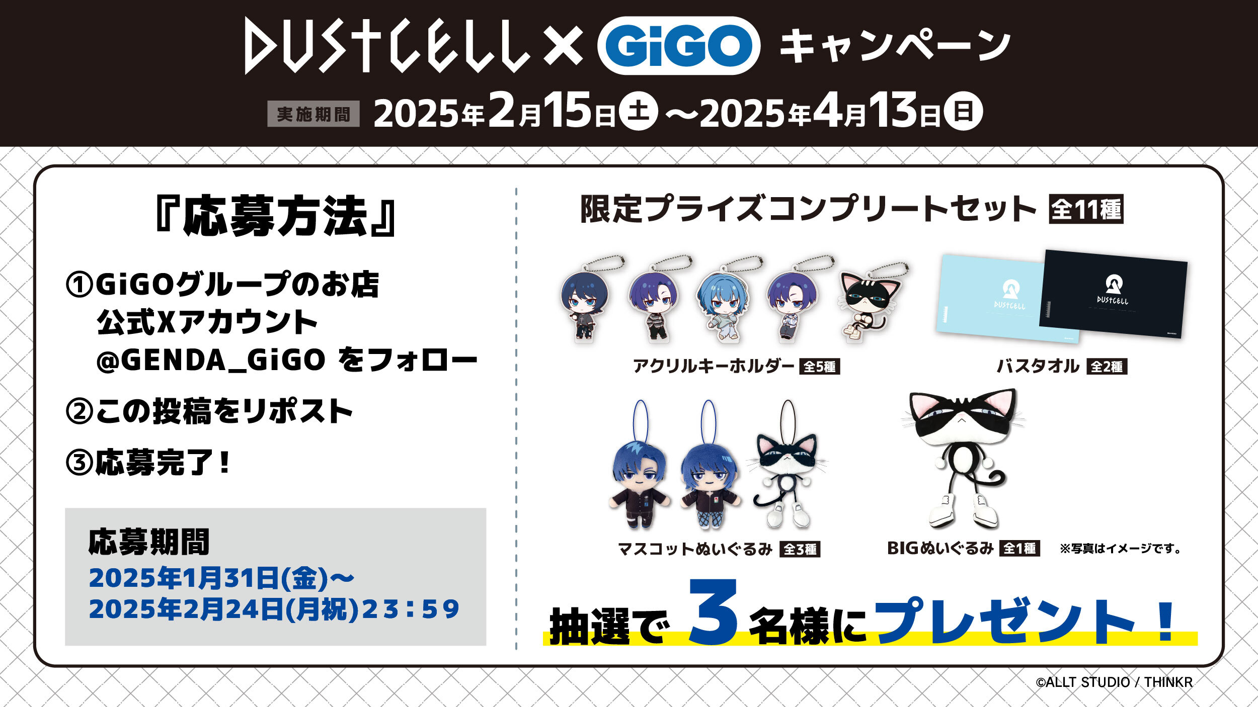 Xアカウント(https://X.com/GENDA_GiGO )をフォローの上で、該当の投稿をリポストされたお客さまの中から抽選で3名様に「限定プライズコンプリートセット(全11種)」をプレゼントいたします。