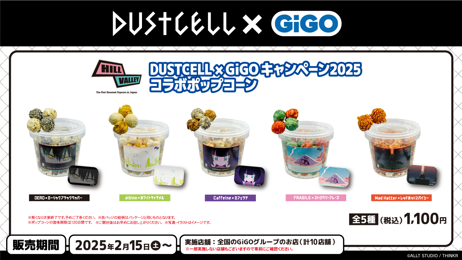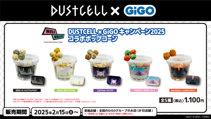株式会社GENDA GiGO Entertainment(本社:東京都港区 代表取締役社長:二宮 一浩 以下「当社」)は GiGOグループのお店におきまして、株式会社THINKR ALLT STUDIO所属アーティスト『DUSTCELL』とのコラボキャンペーンを2025年2月15日(土)より開催いたします。 本キャンペーンは新規描き起こしイラストを使用した限定プライズ、プライズキャンペーンと共にメンバーが監修した色味やフレーバーにもこだわったDUSTCELL楽曲モチーフのコラボポップコーンの展開を行います。