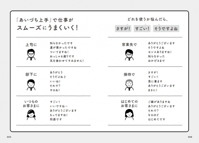 本書では、「知らなかった」「おかげさまで」「才能ですね」「器が大きいですね」「同感です」「まさにー」「苦労されますね」「きてますね~」「とんでもないことです」などなど、200個近い数のあいづちを紹介。
