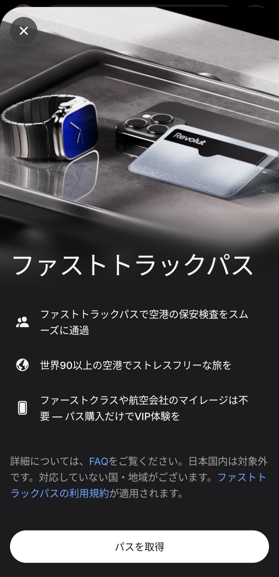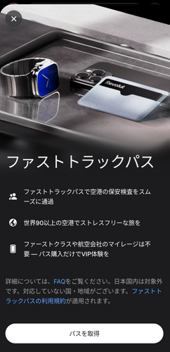 詳細については、ファストトラックパスに関するFAQ( https://help.revolut.com/ja-JP/help/app-features/airport-fast-track/ )をご覧ください。ファストトラックパスの利用規約( https://www.revolut.com/ja-JP/legal/airport-fast-track-pass/ )が適用されます。日本国内の空港は対象外です。