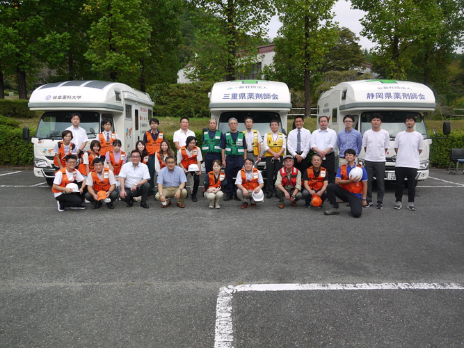 「美濃地方を震源としたマグニチュード8の濃尾地震と同規模の大地震が発生」、「岐阜市内に避難所が開設され、岐阜、静岡、三重の3県のモバイルファーマシーが活動中」、「道路破損や渋滞等により陸路による医薬品供給は困難」、「モバイルファーマシーで必要な医薬品を他のモバイルファーマシーから借りることができれば、被災者へ迅速な医療支援が可能」との想定で実験を行いました。