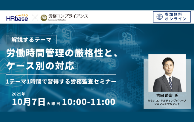 みらいコンサルティンググループ(本社:東京都中央区、代表:久保 光雄 岡⽥ 烈司)は、2025年10月7日にセミナー『~1テーマ1時間で習得する労務監査セミナー 社労士のための労務コンプライアンス調査~ 【第7回】労働時間管理の厳格性と、ケース別の対応』をWEBにて開催します。