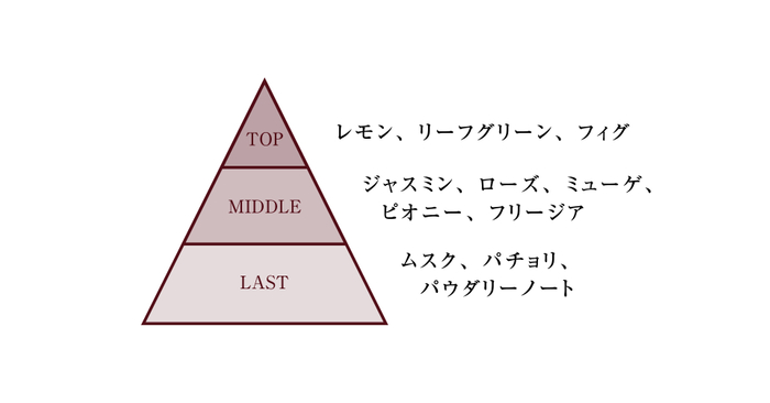フィグの溶け込むような甘さから恍惚と夢見心地になるような可憐な花々の香りが次々と花開き、透き通る女性の肌へ噎せ返るほどに仕込まれた白粉を思わせるパウダリーノートが、怪しくも翻弄されずにはいられない魔性性を感じさせる。