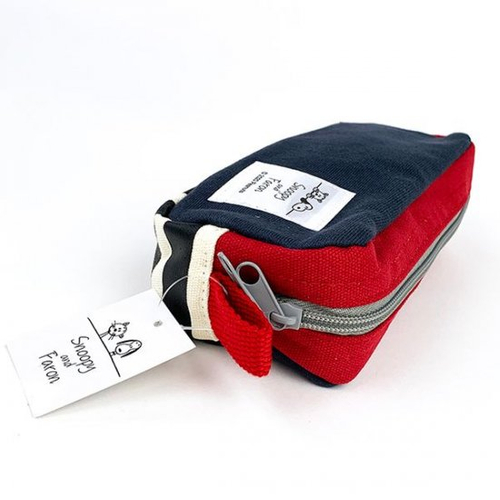 ネイビーと赤のバイカラーがオシャレな、ペンケースです。スウェット素材なので、手触りも柔らかくて軽いのも魅力♪スヌーピー&ファーロンのお馴染みのデザインがタグになって縫い付けられています。