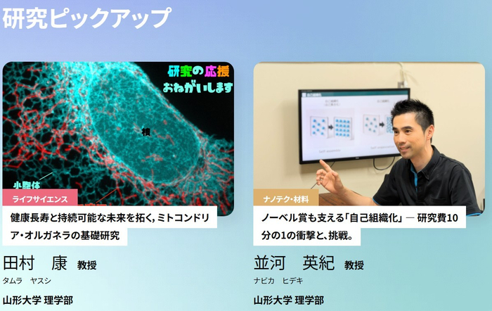 山形大学からは「ノーベル賞も支える自己組織化」の研究を進める並河英紀教授や、「健康長寿と持続可能な未来を拓くミトコンドリア・オルガネラの基礎研究」に取り組む田村康教授など、社会的意義の高い研究を行う研究者が参画しています。また、「山形の子どもたちに最先端の体験を」と題した、最先端機器を小・中・高校生に開放する教育プロジェクトも掲載されており、地域貢献型の研究活動も支援対象となっています。