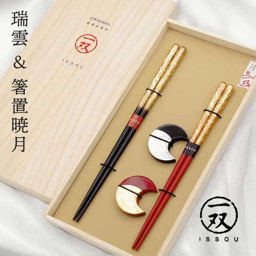 落ち着いた黒と華やかな朱赤に金箔を施した瑞雲柄の夫婦箸と三日月型箸置きが、食卓に上質な華やぎを添えるセットです。