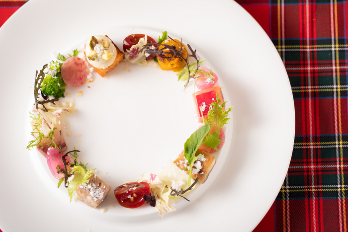 【冷製】クリスマスリースに見立てた6種前菜盛り合わせ(タスマニアサーモンのミキュイ 柑橘の香り / ドライトマトのケークサレ ピスタチオとリコッタチーズ / カボチャとリンゴのミリメロ カレンツとピーカンナッツのアクセント / 田舎風パテとハニーマスタード 冬野菜の自家製ピクルス / 白身魚のフリット スイートチリとココナッツ風 /真鯛のマリネ)
