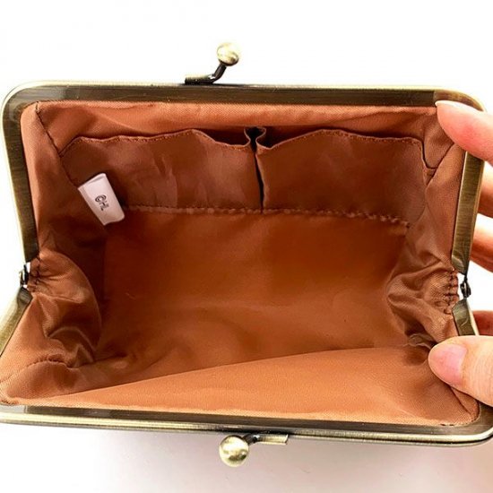 大きさは14×17×4cmほど。がま口の口金の色味も味わい深くて素敵ですよね。