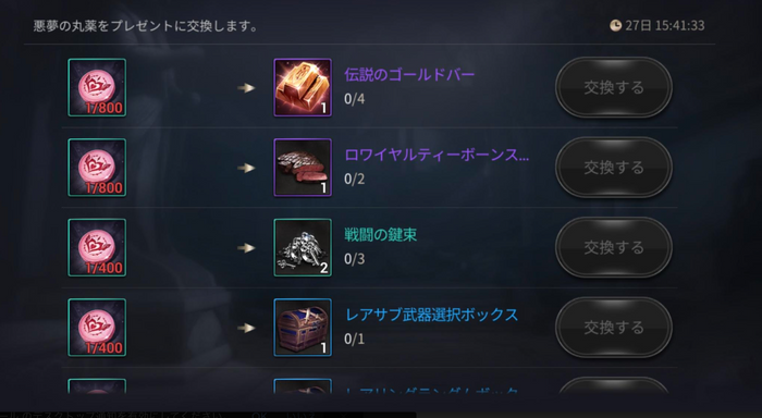イベント期間中に冒険、討伐、伝承の大地で「悪夢の丸薬」が獲得でき、イベントページ内の「悪夢の丸薬交換」で様々なアイテムと交換できます。