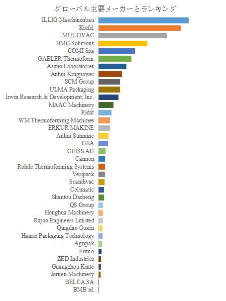 熱成形機市場の競争構造は、欧州の技術系メーカーとアジアの量産メーカーが共存する多極化の様相を呈している。主要企業としては、ILLIG Maschinenbau、Kiefel、MULTIVAC、BMG Solutions、COMI Spa、GABLER Thermoform、Anhui Kingpower、Asano Laboratories、SCM Group、ULMA Packagingなどが挙げられる。これら上位10社は2024年時点で全体の約54.0%の市場シェアを占めており、高度な加工精度と信頼性の面で圧倒的な存在感を示している。欧州勢は高機能・高信頼性を武器に高価格帯市場をリードし、中国をはじめとするアジア勢は生産コスト競争力と地域供給能力でシェア拡大を図っている。さらに、各社はAI制御、ロボティクス連携、省エネ駆動などの分野で積極的にR&D投資を行っており、技術差別化を通じて市場ポジションを強化している。
