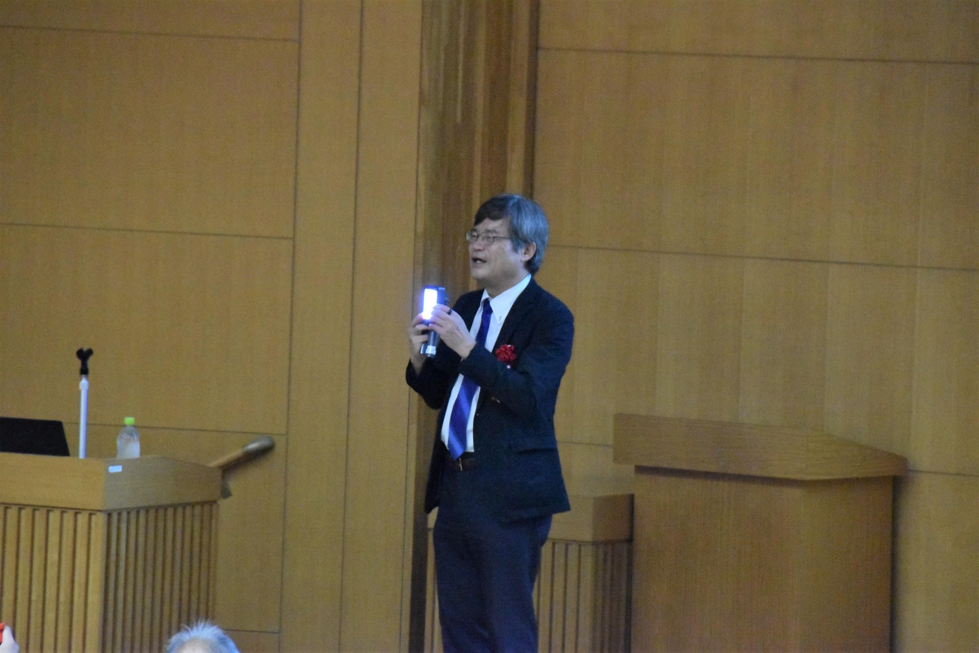 講演タイトルは「大学の研究の社会実装に一番必要なこと」で、同窓会員や在学生、一般の約200人が聴講しました。