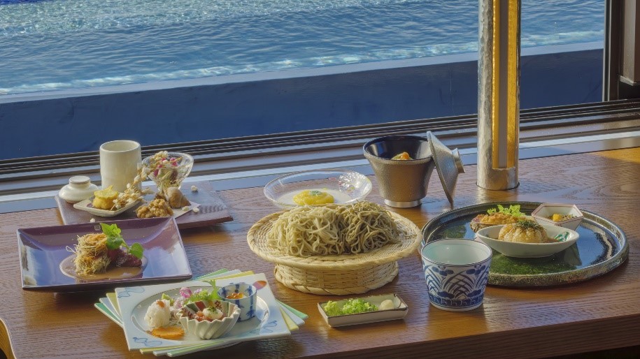 本コースでは、南瓜や銀杏をはじめとする秋野菜や、淡路島産に厳選された食材を割烹会席として提供いたします。前菜には、旬の南瓜の甘味を最大限まで引き出した「南瓜とえびの茶わん蒸」をはじめ、「銀杏コロッケ」、「貝柱と秋野菜柚子クリーム和え」などの品々で秋の恵みをお届けいたします。椀物には、料理長特製の柚子胡椒を用い、香り高く辛味の効いた柚子胡椒が、なめこの風味を引き立て上品な味わいに仕上げた「なめこと柚子胡椒の真丈」。メインの「淡路牛ヘレ カダイフ揚げ」は、淡路牛ヘレに極細の麵状生地を巻いて揚げており、しっとりとした牛ヘレとサクサクした衣の食感を同時に味わうことが出来ます。ソースには栗と淡路産いちじく赤ワイン煮込みを使用し、栗の優しい甘さといちじくの瑞々しい果実味をお愉しみいただけます。蕎麦には、伝統的な“二八蕎麦”と、こんにゃくとアカモク、長命草などを練りこんだ名物“変わり蕎麦”の2種を用意。食事の最後は、「ほうじ茶と柿のパンナコッタ」で秋の余韻を締めくくります。秋の豊かな恵みが詰まった割烹会席で、季節の移ろいを五感でご堪能ください。