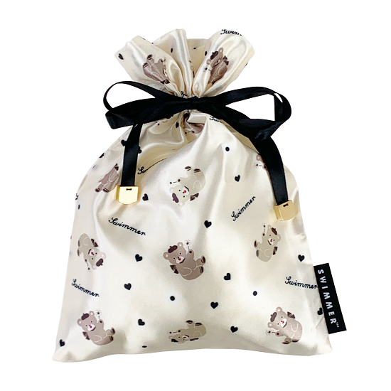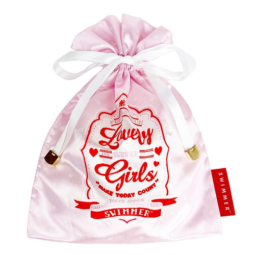まずは先におしゃれ巾着のご紹介♡サテン生地の高級感あるデザイン。リボンとゴールドのパーツがオシャレ!スイマーのタグもしっかり付いています。こんなにキュートだったら、なに入れよう~って悩んじゃう!