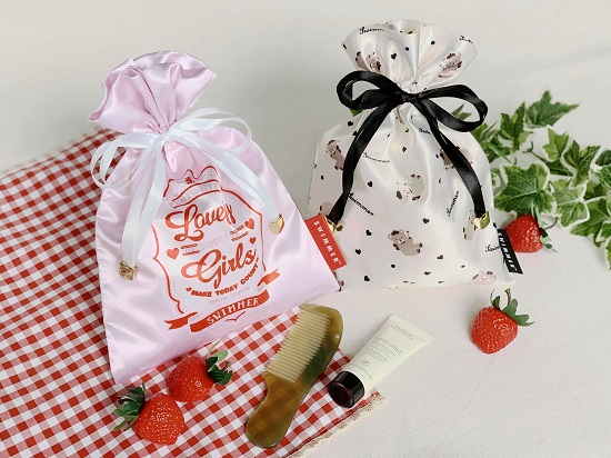 巾着は普段使いにもグッドだし、コンパクトにまとめたい時にミニバッグ用の化粧ポーチにも変身する可愛い便利グッズ♪スイマーのおしゃれ巾着にいろいろと詰め込んで、カワイイライフを楽しんでみて♡