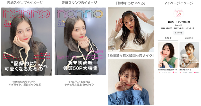 non-no創刊50周年を記念して『カバーガールなりきり』表紙スタンプ2種と、non-noモデル鈴木ゆうか、松川菜々花デザイン監修のオリジナルスタンプ2種をリリースいたしました。