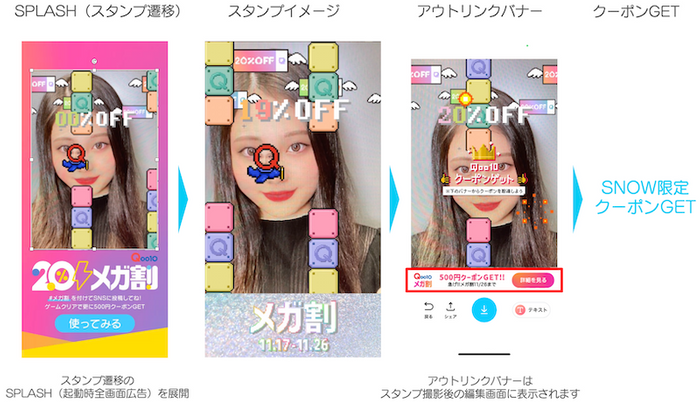 ゲームスタンプでは顔認識機能でブロックを避けゴールを目指し、ゲーム終了後メガ割セールとは別で使える限定クーポンを配布いたしました。