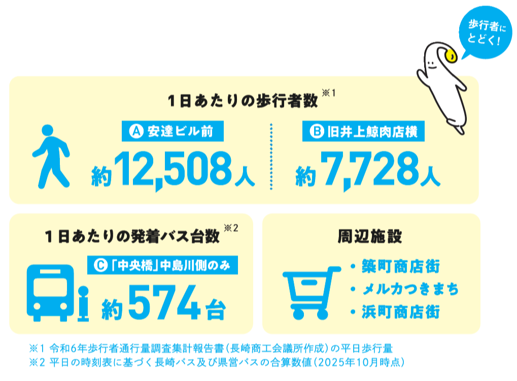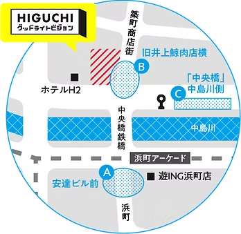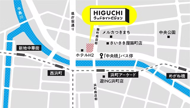 「HIGUCHIグッドライトビジョン」は、長崎市築町商店街の入り口という絶好のロケーションに位置しています。ここは築町と浜町を結び、バス・路面電車の主要停留所が集まる、まさに「地元の人々が足を運ぶ、長崎の暮らしの交差点」です。中央橋鉄橋やバス停に近接しているため、信号待ちや乗り換えで足を止めた多くの人々の視線に自然と入り込みます。