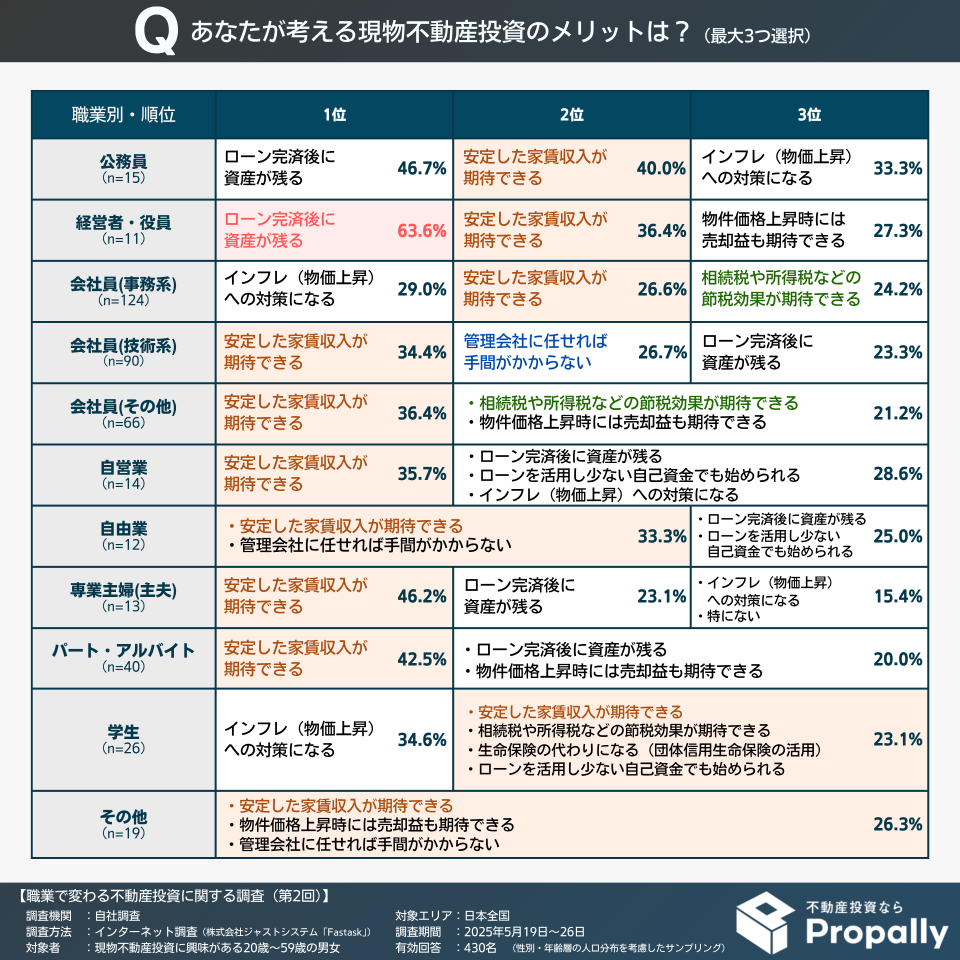 以下の表は、職業別に現物不動産投資に期待するメリットの上位3項目をまとめたものです。