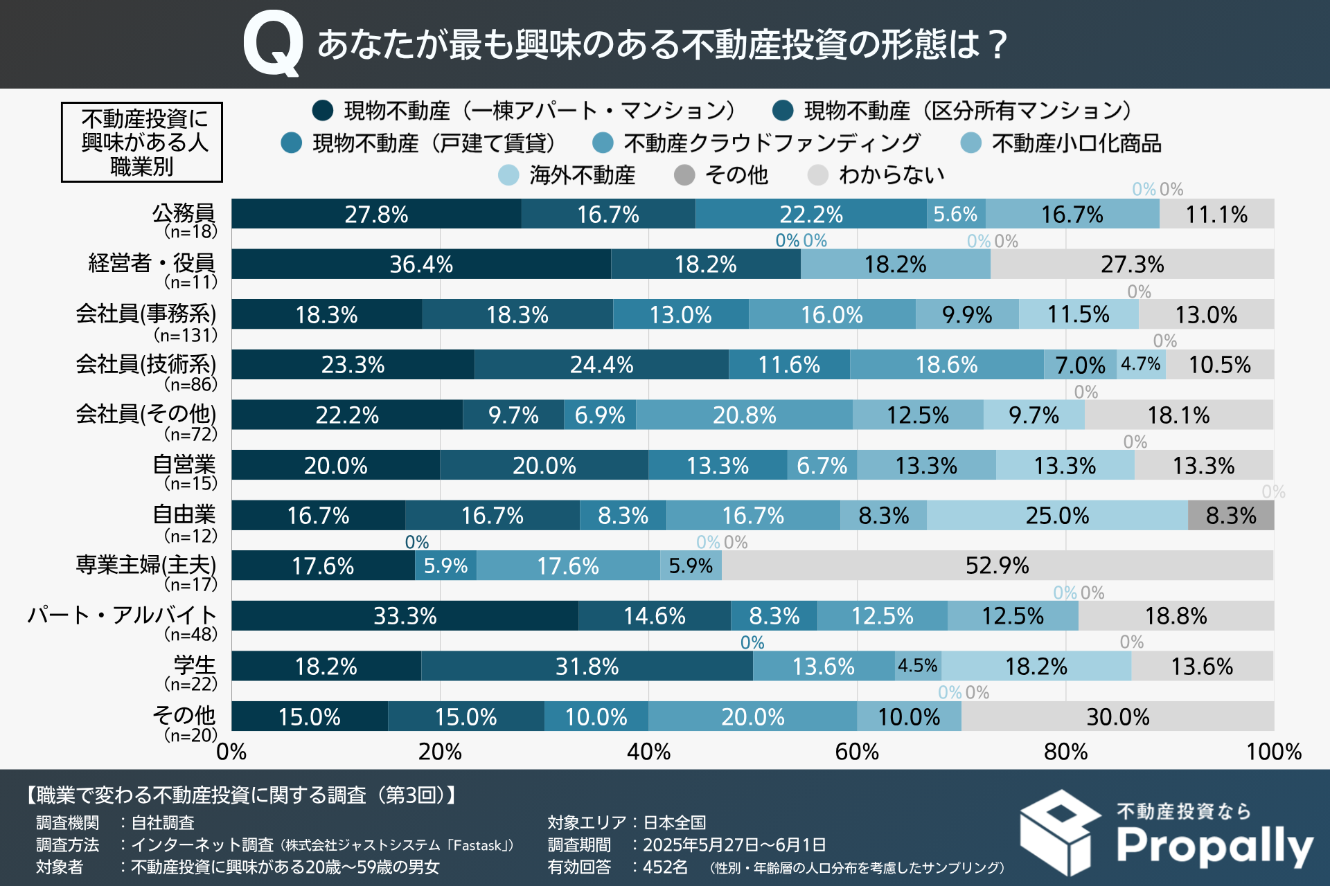続いて、不動産投資に興味を持つ人が、クラウドファンディングや小口化商品なども含む様々な投資形態の中から、具体的にどれに最も関心を持っているかを尋ねました。次のグラフは、その結果を職業別に集計したものです。