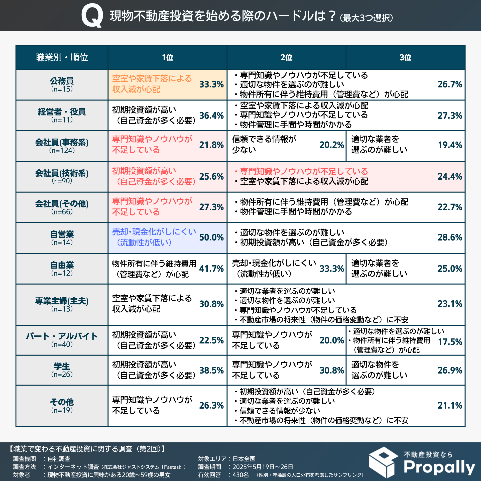 以下の表は、職業別に「不動産投資を始める上でハードルになる点」の上位3項目をまとめたものです。