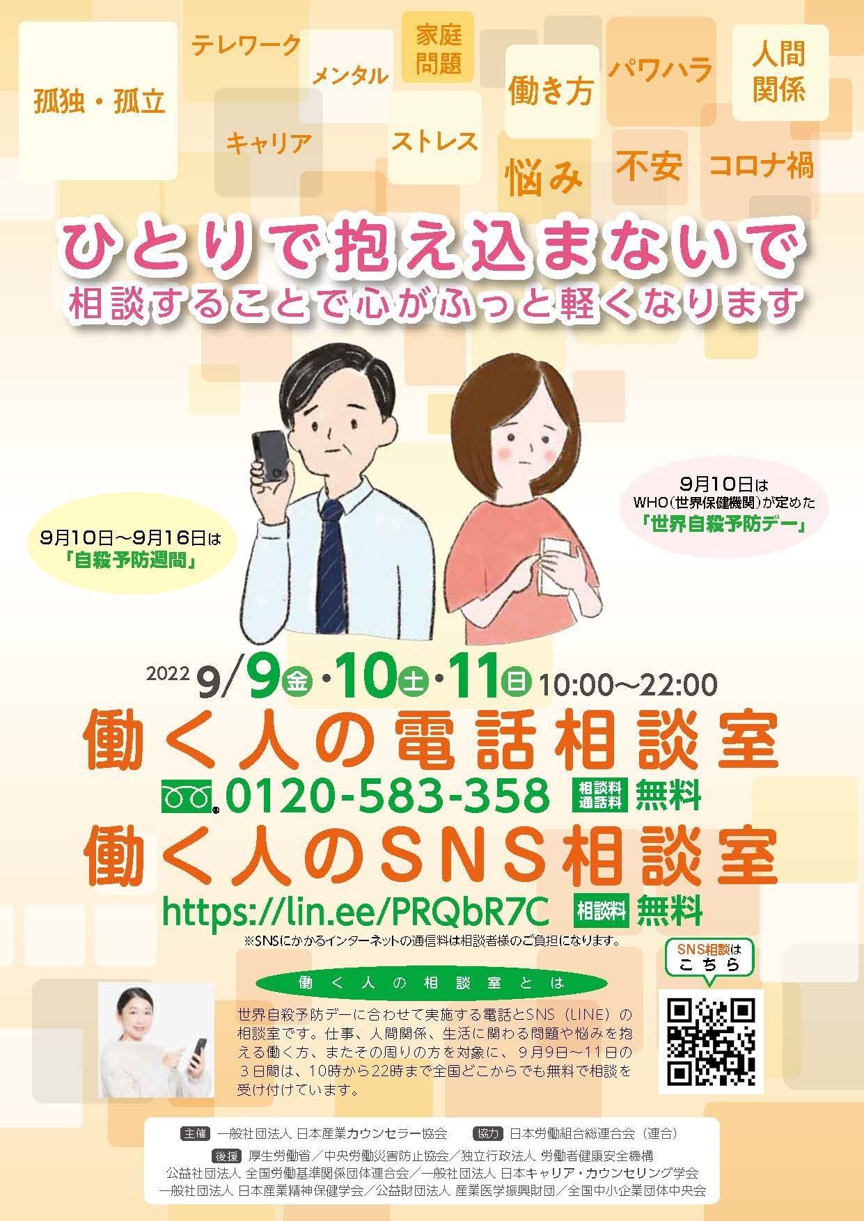働く人の心の問題解決を支援する「産業カウンセラー」の資格を有する専門家を育成している一般社団法人 日本産業カウンセラー協会(会長:田中 節子)では、WHO(世界保健機関)の定める世界自殺予防デーにあわせて「ひとりで抱え込まないで」をテーマに、9月9日(金)より3日間、全国の各支部・事業所の19か所で相談室を開設し、無料の相談対応を実施します。