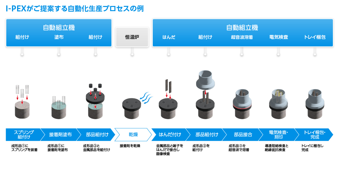 自動機のご提案のみならず、生産プロセス全体の見直しからお手伝いいたします。成形技術をはじめ、I-PEXが培ったものづくりのコア技術と、製造プロセスで必要となる「接着」「接合」「溶着」「電気検査」などを組み合わせることで、ものづくりのスタートから完成まで、プロセス全体をご提案いたします。