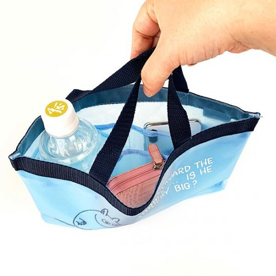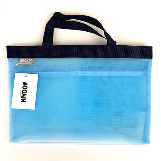 爽やかなブルーのメッシュ素材に、ムーミンがデザインされたバッグインバッグです。