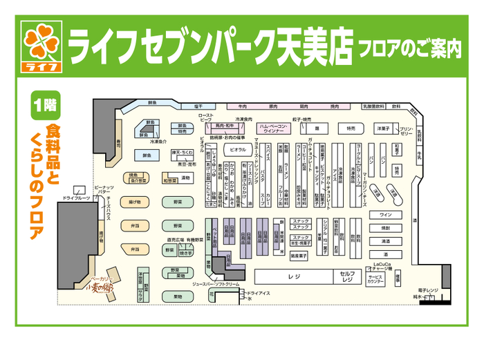 ・当店は、国道309号線・県道12号線・阪神高速「三宅IC」が交わるポイントに位置するショッピングモール「セブンパーク天美」の1階に入店しています。セブン&アイ・クリエイトリンクの手がける大型商業施設に、ライフが初出店いたします。