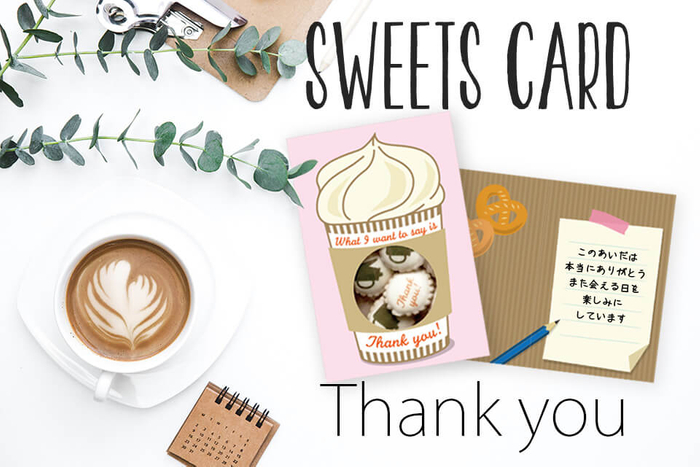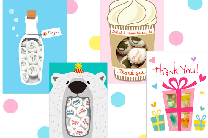 スイーツカードは、表面の窓からお菓子が見えるようになっており、お菓子もデザインの一部となっています。