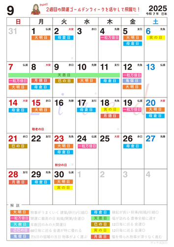 9月の縁起の良い開運日がひと目でわかる!吉日カレンダー画像
