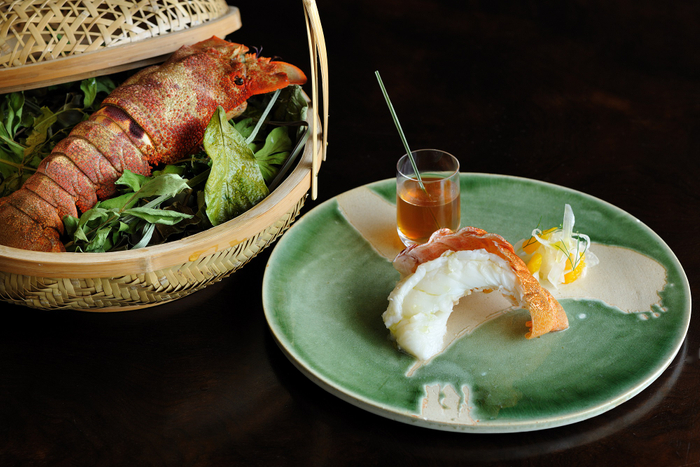 産地や品質の保証を示すタグが付き、大皿でもはみでるほどの「タグ付きの活蟹」。爪、脚、だき身のそれぞれがもつ旨味、甘さ、食感などを、一杯まるごと味わい尽くせます。蟹そのものの味を堪能するのはもちろんのこと、部位ごとの味の違いや変化にも楽しさを見いだしながら最後まで驚きや感動とともに食べられるよう、6種類のコンディメント(つけダレ)を用意します。また、ご当地の文化に着想を得た、迫力ある見栄えも特徴です。