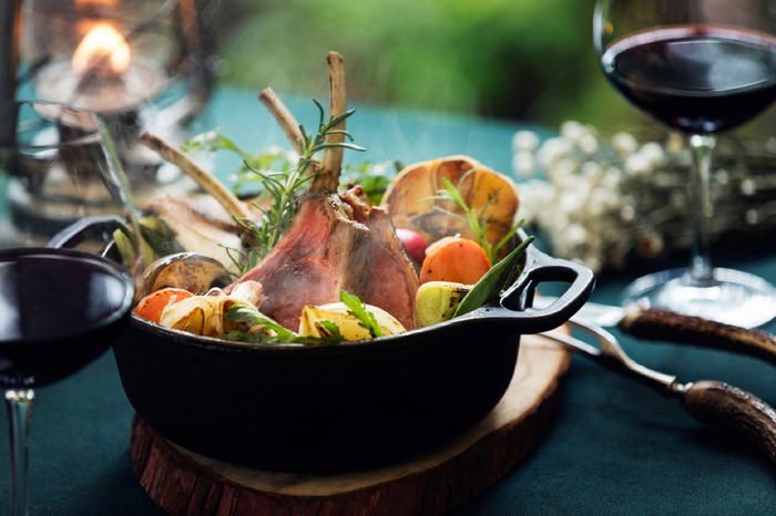 森の中にあるアウトドアダイニングで用意する体験型のディナーです。グランピングマスターのサポートの下、アウトドア器具で料理を仕上げ、旬の野菜と共に狩猟肉を楽しめます。季節の変化によって味わいが異なる「鹿肉」や「猪肉」などの狩猟肉の魅力を、おひとりさま用のボリュームで提供します。