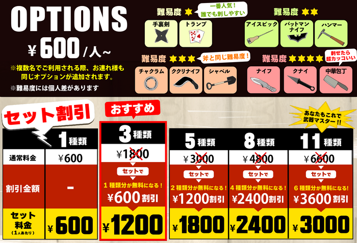 "クナイ"投げ放題とは、AXE THROWINGを提供してる対象の施設でオプションとして追加することができます。