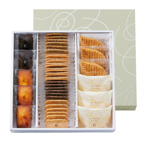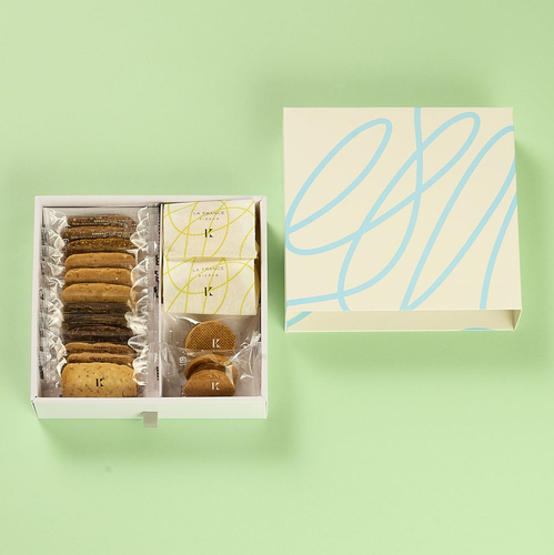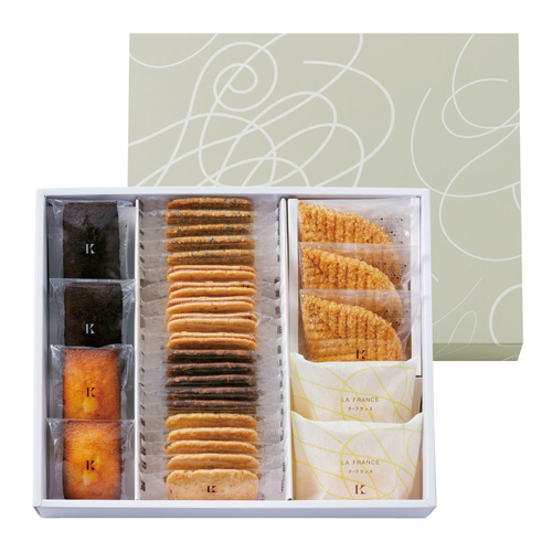 製法にこだわり、じっくりと寝かせてから焼き上げることで繊細でサクッと軽い口当たりの「きのとやクッキー」と、みずみずしい芳醇な味わいのゼリー「ラ・フランス」、「リーフパイ」を詰め合わせたギフトは贈答用に熨斗をおかけすることも可能です。