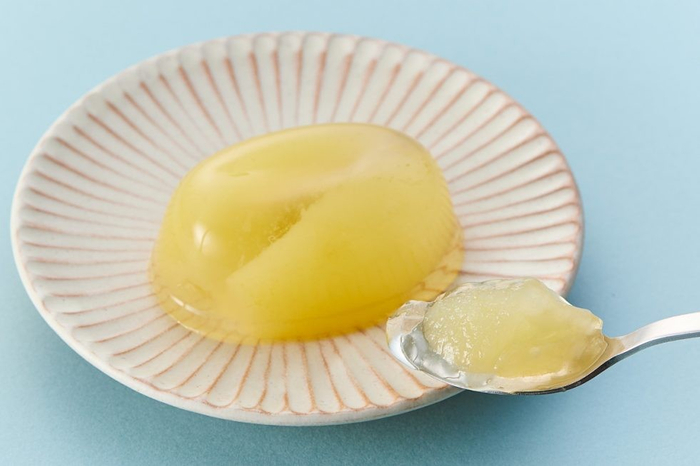 年に一度の美味しい季節に収穫された山形県産ラ・フランスのコンポートをカットし、果肉をそのまま食感豊かなゼリーにとじ込めました。
