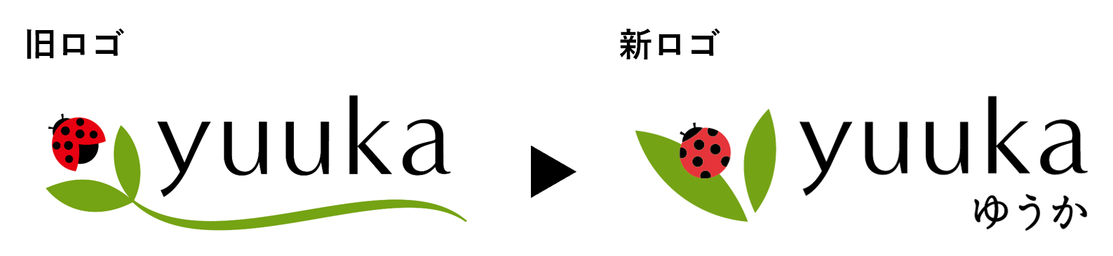 新しくyuuka(ゆうか)表記となり、茶葉とてんとう虫はそのままに、生活に寄り添うようなシンプルで優しいシンボルマークに。