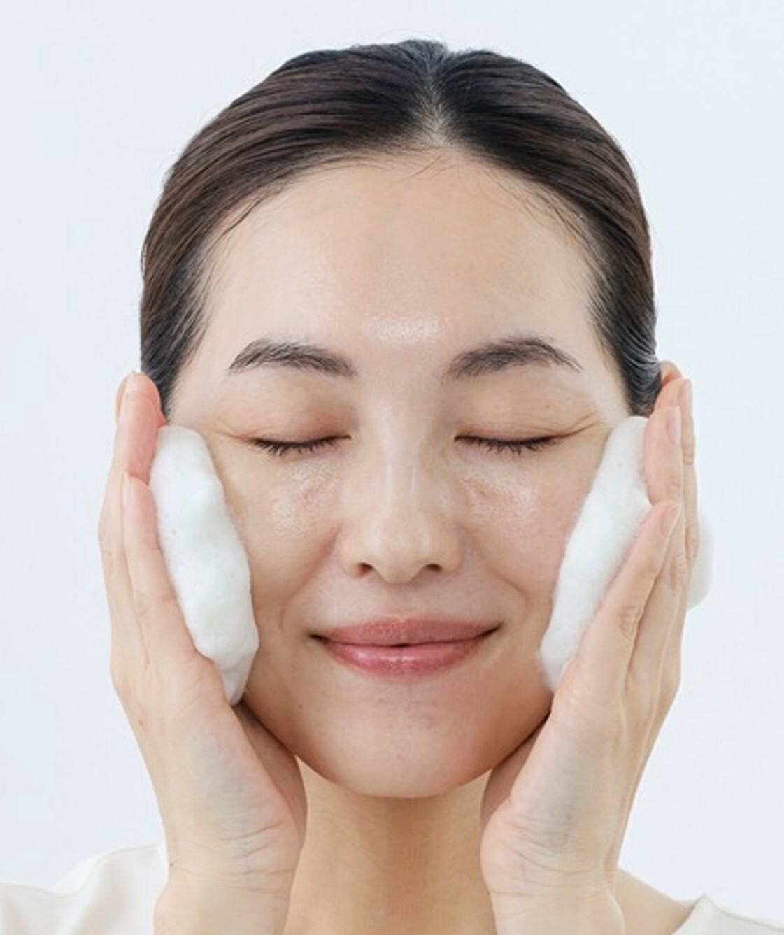 弾力と吸着力のある泡による洗顔と32°Cの日向水(ひなたみず)すすぎがキメをやさしく守りながら、肌を解きほぐします。