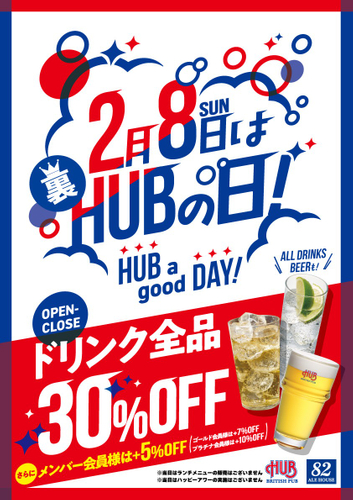 当社は8月2日を「ハブの日」とし、お客様感謝デーとして毎年セールを実施しております。その「裏」である2月8日においても第2のお客様感謝デーとして「裏ハブの日」セールをHUB・82にて実施しております。「裏ハブの日」はHUB・82全店が終日(一部店舗では16時~)、ドリンク全品30%OFFで営業いたします。さらに、メンバー会員様には通常の会員割引も適用されます。