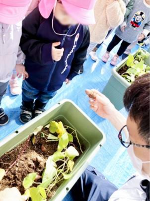 今回収穫をした「さつまいも」は、7月にさくら保育園の子どもたちとガーデンを管理するホロニクスヘルスケア㈱植栽・養蜂管理課の担当者が、苗を植え育てたものです。少し深めのプランター4台が子どもたちのさつまいも畑です。おいも掘りは、昨年に続き2度目です。ひとつ大きく成長した園児たちは、昨年よりも積極的に芋蔓を引き、プランターの中の小さなさつまいもを見つけてはどんどん収穫していました。幼児の手のひらにピッタリサイズのかわいいサツマイモが何十本も収穫されました。歓喜の声とキラキラした目がさくらテラスガーデンに溢れ、「さつまいもがここでできるのね!」と、驚くカフェのお客様もいらっしゃいました。