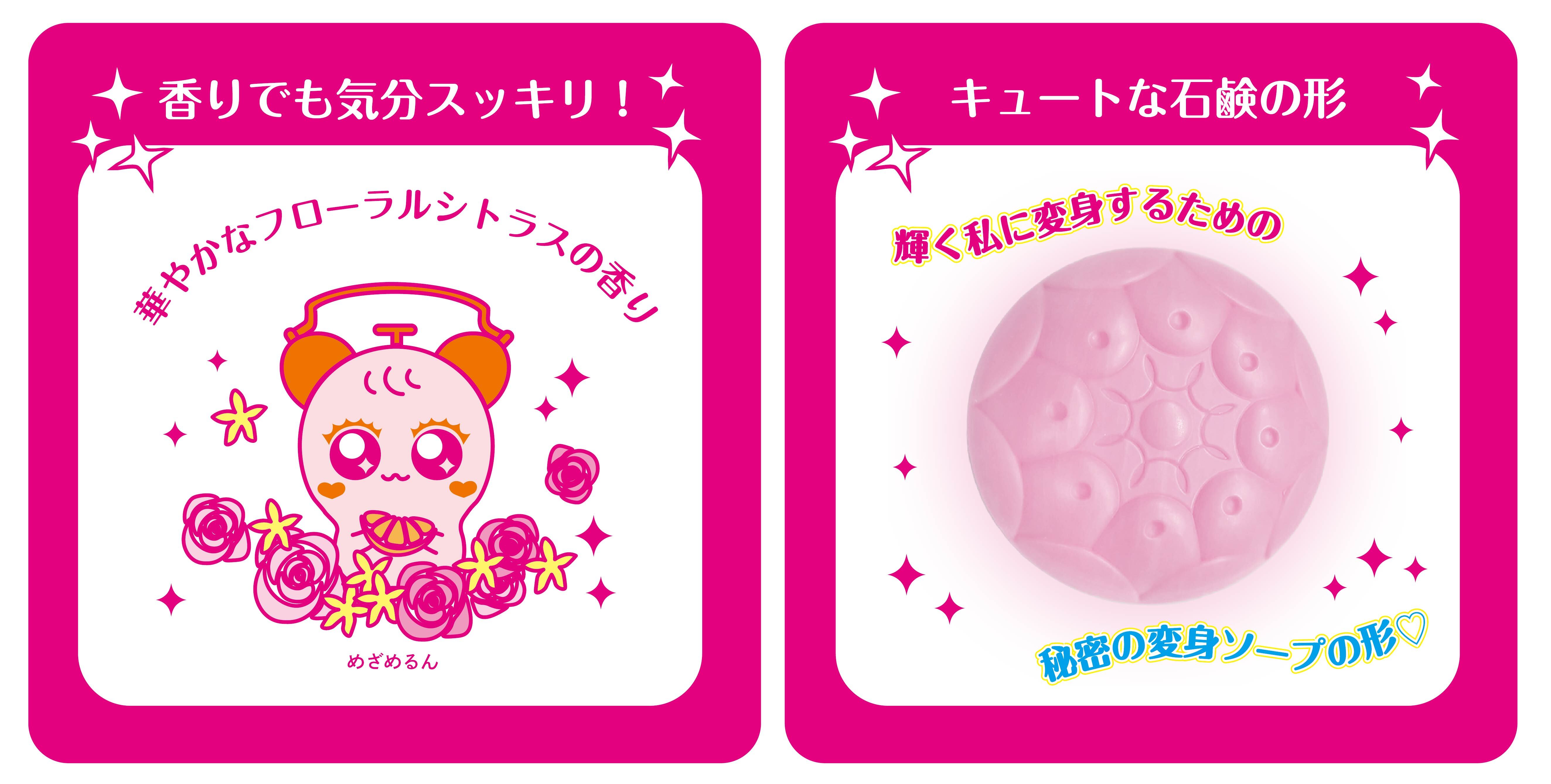 石鹸の形はこのために作成した、変身できちゃいそう!?なキラキラピンク色のオリジナルの変身ソープの形!「めざめるん」で輝く新生活を迎えましょう!