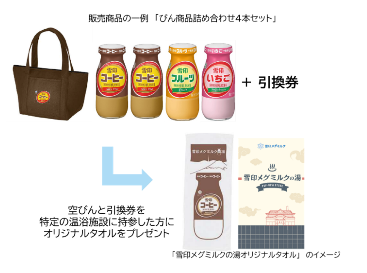 「びん商品詰め合わせ4本セット」をご購入いただいたお客様に、大阪府内の特定の温浴施設で「雪印メグミルクの湯オリジナルタオル」と交換できる引換券を、1点につき1枚プレゼントします。