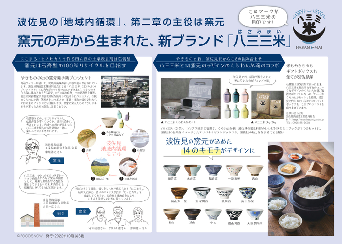 今回は第二弾として、窯元たちが立ち上がり、製造側の「つくる責任」のもと真剣に石膏型リサイクルに取り組み、農家と連携し石膏を土壌改良剤として使用して出来上がった「ヒノヒカリ」「にこまる」と14社の窯元が「くらわんか碗」にそれぞれの特徴を活かしデザインを施した新しいお茶碗とコンプラ瓶型の箸置きをセットにした「八三三米(はさみまい)くらわんかセット」が完成しました。