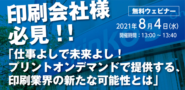 キンコーズ・ジャパン株式会社(本社:東京都港区、代表取締役社長:渡辺 浩基、以下 キンコーズ)は、印刷業者に特化したオンラインセミナー『仕事よしで未来よし!プリントオンデマンドで提供する、印刷の新たな可能性とは』を2021年8月4日に開催します。