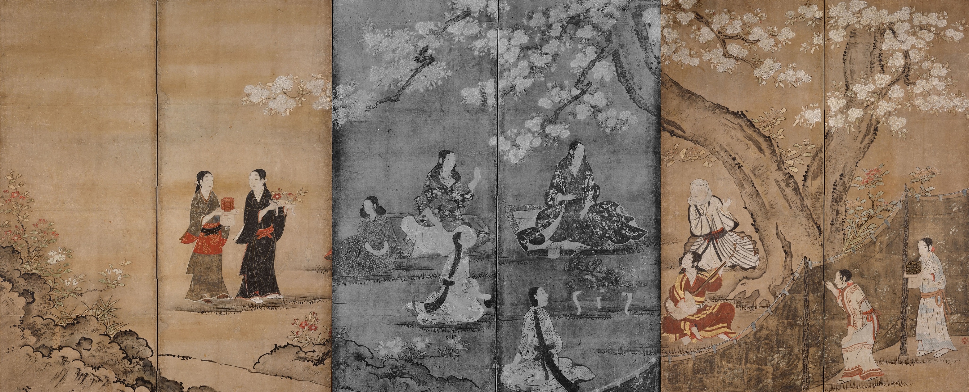狩野長信(1577-1654)による屏風絵。桜の下で、賑やかに宴を催すさまを描いている。