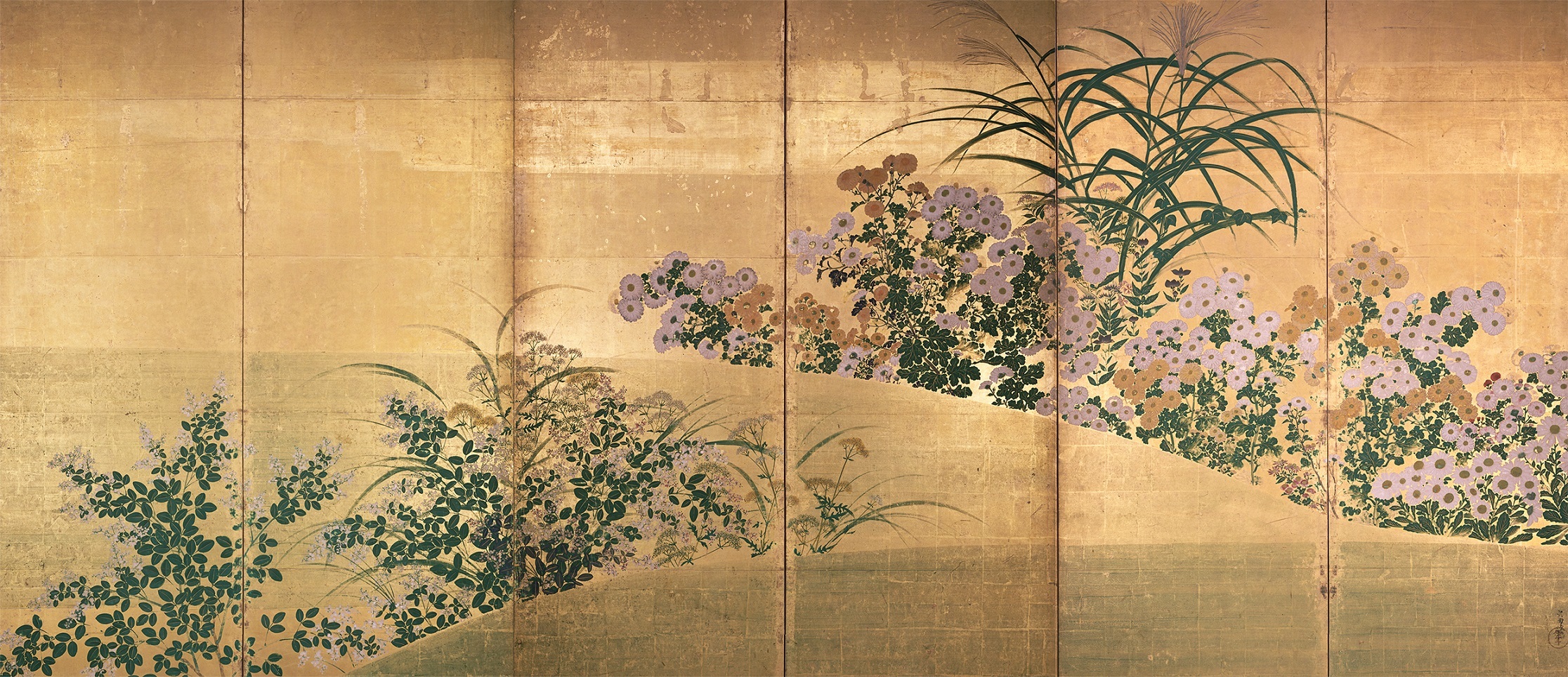 俵屋宗雪(江戸時代前期・17世紀前半ころ活躍)による屏風絵。野辺に芙蓉(ふよう)、萩、おみなえしといった秋の七草が咲くさまが描かれている。左右を入れ替えても連続した画面となるような構図となっている。