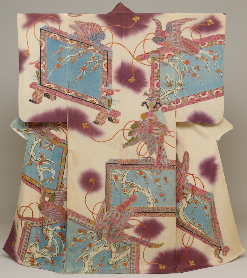 友禅染で模様をあらわした振袖(江戸時代中期頃)。衝立(ついたて)の上に鷹が留まり、その衝立のなかに梅の樹が描かれているという図案。誰が着ていたか、発注者は誰かなどの記録はないが、当時の着物としてはサイズがやや大きく、鷹というモチーフも武将に好まれていたため、女性向けではなく男性向けに作られた着物の可能性もある。